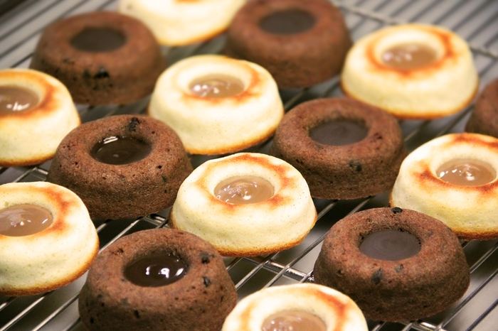 甘みを抑えた大人なチョコレートを感じられる「チョコレート」と、よりまろやかに優しい味わいを楽しめる「ミルク」の2種をご用意しました。ふんわり生地とアクセントに流し込んだGAKU自慢のブレンドチョコレートがマリアージュを生み出します。
