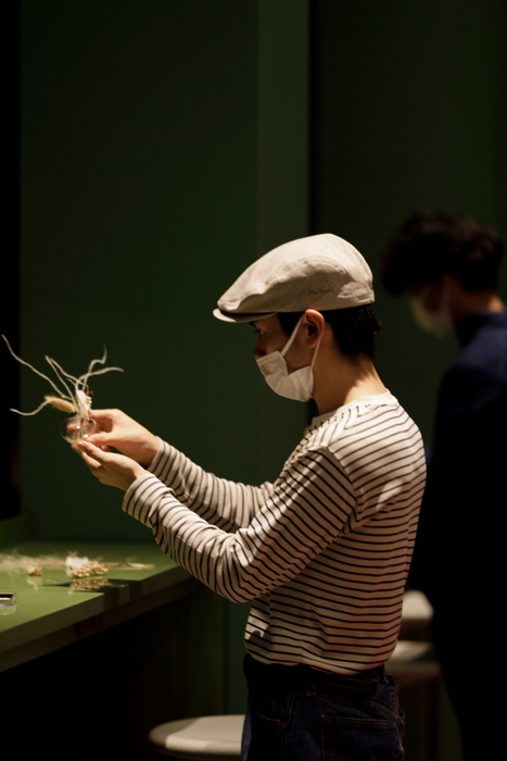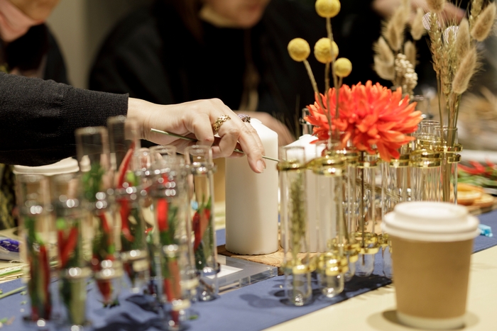 toggle hotelの特徴でもある、色で気持ちを切り替えることを意識した。メインエレメントカラーであるグリーン・ホワイトにレッドカーペットを部分的に敷き、色の組み合わせでクリスマスを想起。また、賑やかで煌びやかなクリスマスの日常を切り取りそれらの色に合わせてゴールドやシルバーなど、天井の照明によって反射が綺麗に映るアイテムを部分的に取り入れた。レッドカーペットはエレベーターの扉が開いた瞬間から始まり、入り口から受付、レストルーム、そしてサイドに設けられたテラスに至るまで全ての動線を可視化している。特にカフェカウンターまで突き当たりそこから左右に分岐させたレッドカーペットはテラス席に自然と行きたくなるような動線の誘導を意識した。色のイメージだけでなく、レッドカーペットを歩くという行為に特別感や高揚感を感じて楽しんで欲しいという思いからこれをメインコンセプトとした。そして、各テーブルにはウッドボードの上に生花やドライフラワーを添えた。ここでもメインエレメントカラーであるレッドやグリーン、ホワイトを構成して全体的なバランスを重視した。レッドカーペットで構成された空間は直線的で動きが少なかった為、雲龍柳など枝ものの生花を取り入れることで直線的な空間に曲線的な動きをつけた。カフェブースとレストルームには一定の距離があったが、全体的な雰囲気にムラを作りたくなかった為、レストルーム全室と入り口前にドライフラワーを添えた。テラス席は夜にも楽しんで欲しいという思いから、元々あった植物にイルミネーションライトを設置。日中は日当たりの良い場所で、夜はライトと窓に反射されたレッドカーペットで特別感を感じながら植物に引っかけられたパラシュートサンタを探して欲しい。クリスマスツリーというアイコン抜きでいかにクリスマスを祝福させるかを1番意識した。