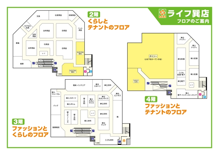 生活関連売り場を2階へ移設し、よりお買い物しやすい売り場にリニューアルいたします。2月下旬には、4階に100円ショップ「ダイソー」が新しく入店し、一度のお買い物で欲しいものがそろう「ワンストップショッピング」を実現いたします。
