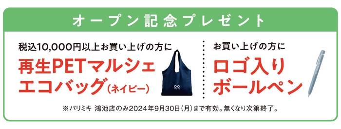 オープンを記念し、税込10,000円以上お買い上げの方に「再生PETマルシェエコバッグ」を、また、期間中お買い上げの方に「ロゴ入りボールペン」をプレゼント!