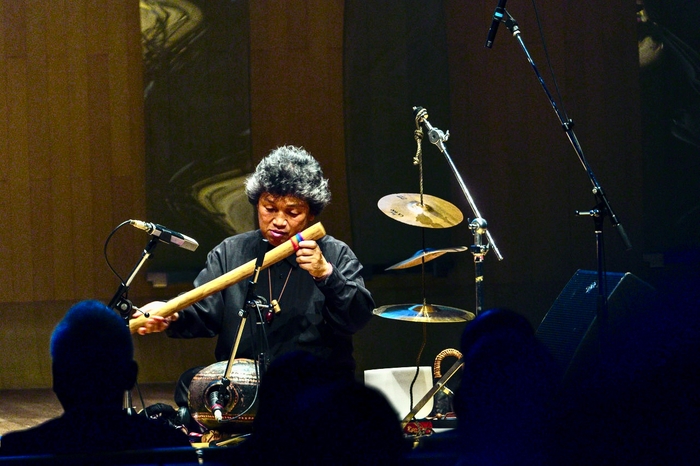 そしてコンサートの中盤、いよいよ「眠ってください」の時間、パーカッショニストの山村氏とエイコン氏の40分間にわたる即興演奏のコーナーがスタート。コーナーが10分を越えた頃には、会場のあちこちから「カラン」「カタン」という音がする。どうやら手にした携帯電話を落としてしまったらしく、静かな寝息も聞こえてきた。まさにお客さまが求めていた「良質な睡眠」導入の瞬間だった。しかしその一方で、ステージのスクリーンには今回映像の演出を担当したラファエル小関彰氏がAIを一切使用せずに創り出した太陽系の美しい惑星たちが、エイコン氏の演奏と絡み合いながら、見事にライブを演出した。その映像の素晴らしさに目を奪われた人たちにとって、眠ってしまうにはあまりにももったいない演出だった。