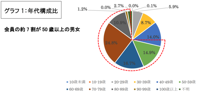 ・会員の約7割(68.6%)が男性(Male)・女性(Female)の50歳以上の方で構成されています。