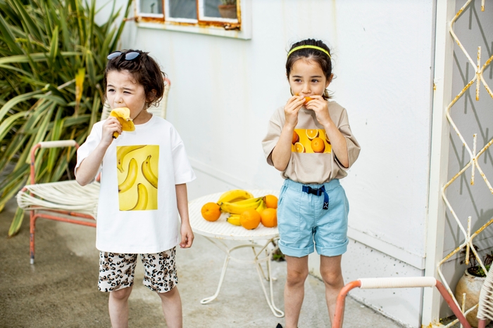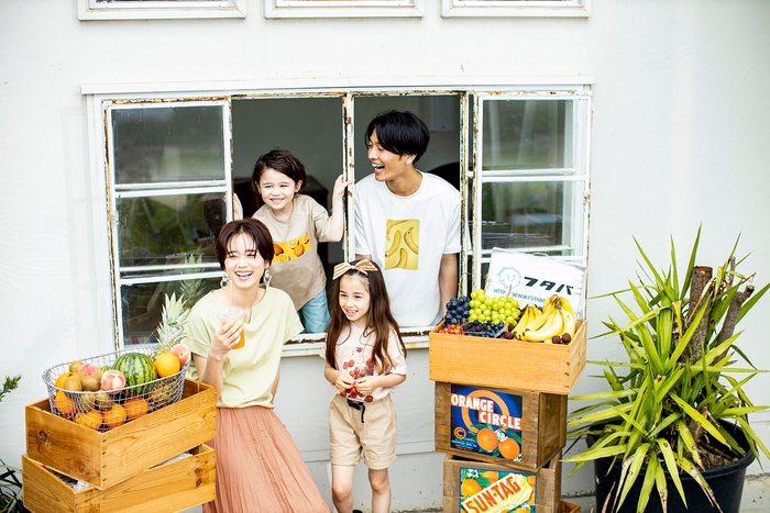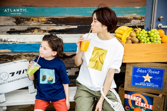 ワールドグループの株式会社スタイルフォースが展開するメンズ・レディース・キッズのファッションストア「THE SHOP TK(ザ ショップ ティーケー)」は、東京・中野にある老舗果物店「フタバフルーツ」とのコラボレーション商品第二弾を7月7日(水)から、全国の「THE SHOP TK」店頭とワールドオンラインストア(https://store.world.co.jp/s/brand/the-shop-tk/)で発売します。メンズはカラーTシャツとショートパンツ 、レディースはキーネックトップスとプリーツスカートと夏らしいコーディネートに仕上がるアイテムを揃えました。親子で楽しく着こなせるフルーツフォト Tシャツは、バナナ、オレンジ、キウイ、チェリーのプリントのラインナップです。