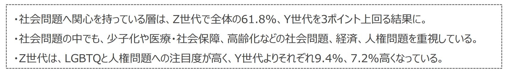 今後の日本やビジネスの中心を担っていく若者、Z世代が今日本の社会に期待することは、何なのか。Z世代の社会問題についての意識を把握することで、彼らの考え方や価値観をより理解する。また他の世代と比較することで、その違いについても把握する。
