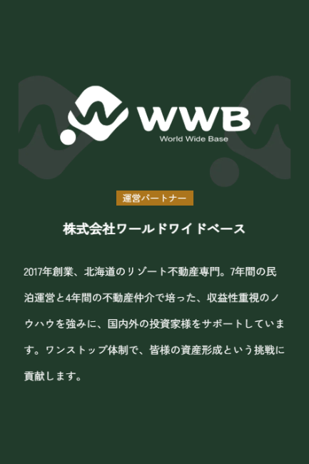 2017年創業の株式会社ワールドワイドベースは、北海道のリゾートエリアの不動産売買や民泊運営、都市部でのマンスリーマンション運営に関して、圧倒的な経験値を持っています。リゾートエリアでの不動産活用を中心にクウカン株式会社とは長い提携関係にあり、今回のプロジェクト「Shikauchi」に関しても引き続きお手伝いいただいております。