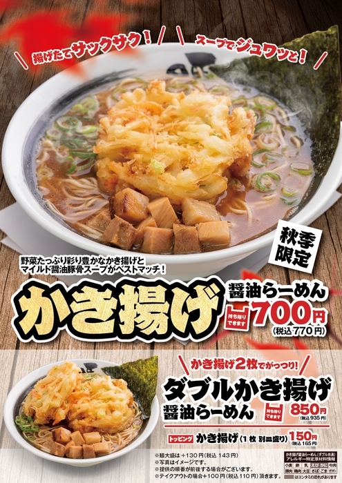 さらに、かき揚げ2枚トッピングの「ダブルかき揚げ醤油らーめん」の販売もいたします。かき揚げ2枚トッピングの大ボリュームできっとご満足いただけます。