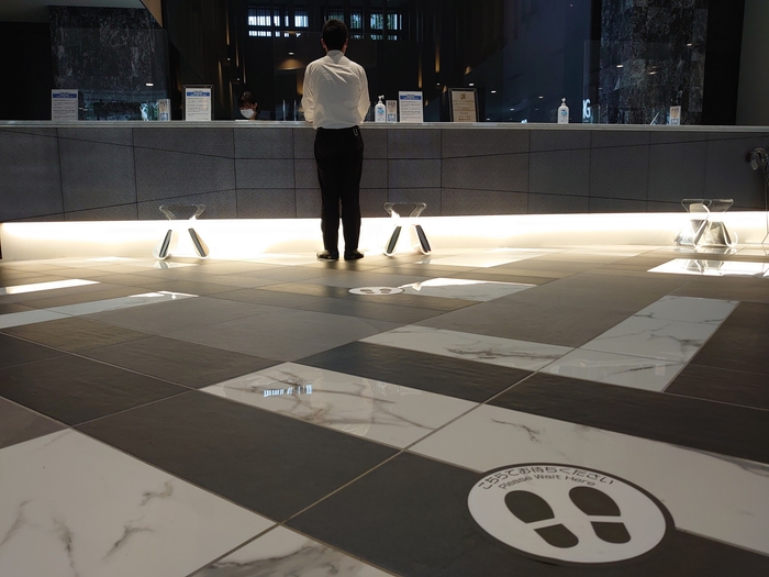 フロントやレストランの入口では、お客様同士の距離を保つため、床に目印の設置をおこなっております
