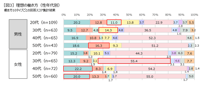 理想の働き方タイプの割合分布を性年代別で見ると、「⑥ワークライフバランス型」が全性年代で最も多く、その中でも、「女性30代」は、55.4%と一番多い結果に。一方、「男性20代」では22.9%にとどまり、「①安定志向型」(20.2%)が僅差で2位となったほか、 「③ポジションアップ志向型」(11.0%)も多い結果になっていますが、他の性別年代と比べてタイプの偏りが少なく、理想とする働き方が多様性に富む様子が分かりました。その他、「男性30代」では「④自己実現・スキルアップ型」(14.3%)、「男性50代」では「②収入重視型」(16.3%)、「女性40代」「女性50代」では「①安定志向型」 (22.2%、20.0%)が多いなど、性年代別の特徴が表れる結果となりました[図3]。