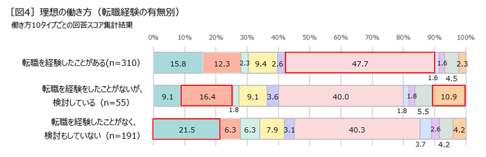 転職経験による違いを見たところ、「転職経験者」は「⑥ワークライフバランス型」(47.7%)が特に多く、仕事とプライベート両方の充実を願う人が多いようです。一方、「転職経験無し/検討中」の人は、「②収入重視型」(16.4%)や「⑩キャリア探求型」(10.9%)が多く、「転職未経験/検討無し」では「①安定志向型」(21.5%)が多いことが分かりました[図4]。