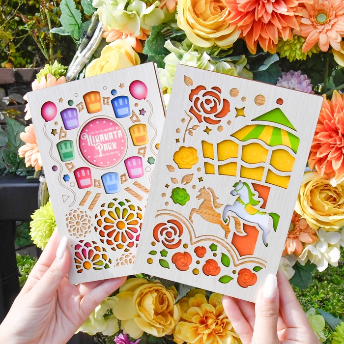 ひらかたパークのレトロかわいい2階建てメリーゴーラウンドとローズガーデンの景色を再現した御朱印帳です。