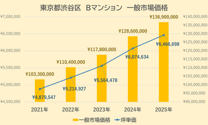 Bマンションの一般市場価格・坪単価の推移は上記【図4】の通りです。