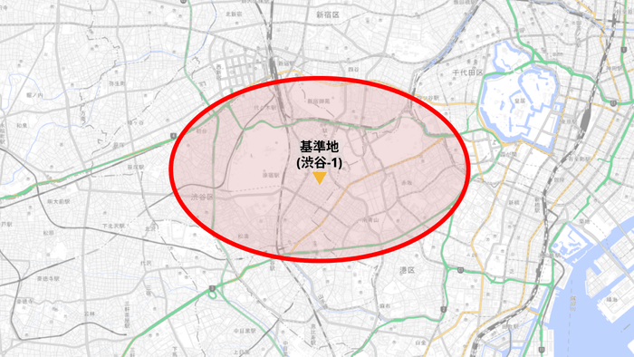 今回は、基準地(渋谷-1)周辺の下記エリア内のマンション事例①(築10年~19年)、マンション事例②(築20年~29年)、マンション事例③(築30年~45年)を対象に、過去5年の一般市場価格を抽出します。