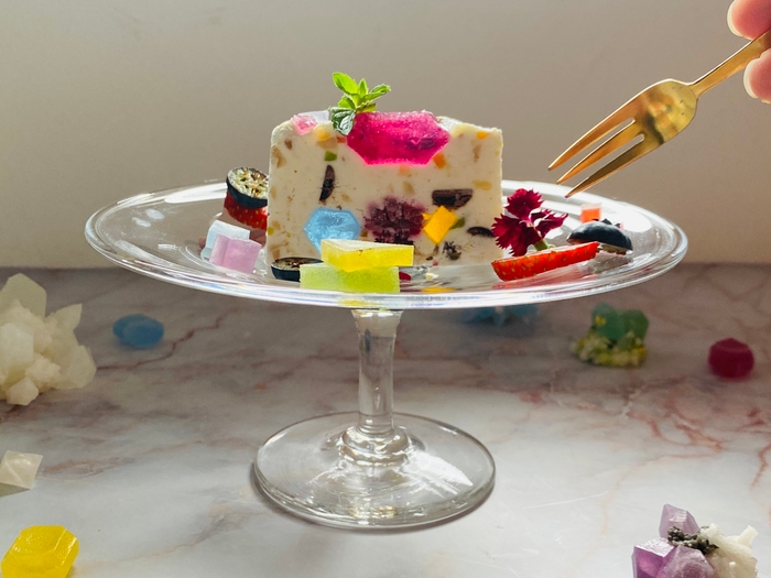 宝石のカッサータはその美しさもさることながら、リコッタチーズや、確かな原料から作られるオーム乳業の純生クリームを使用し、琥珀糖の優しい甘み、ラズベリーやオレンジピールの凝縮された甘酸っぱい味のアクセント、口の中で弾けるナッツの食感をクリームと一緒に楽しめる新感覚スイーツです。