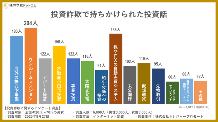 続いて、どんな投資話を持ちかけられたのかについて尋ねました(選択式・複数回答)。最も多かったのは「ワンルームマンション」の204人(20.2%)で、選択肢の中では唯一2割を超えました。次に多かったのは「株やFXの自動売買システム」188人(18.6%)、続いて「海外の株式や事業」183人(18.1%)となりました。