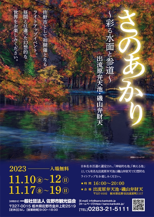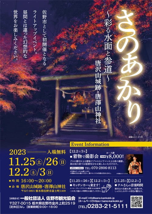 今までにない夜の観光として、佐野市の観光名所「出流原弁天池・磯山弁財天」及び「唐沢山城跡・唐澤山神社」をライトアップいたします。普段とは異なる幻想的な世界をお楽しみください。