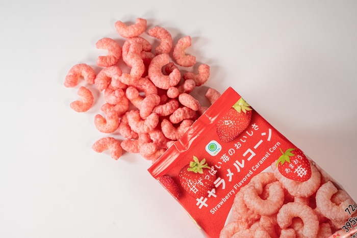 【内容】あまおういちごを使用した、色鮮やかで甘ずっぱい味わいのキャラメルコーンです。