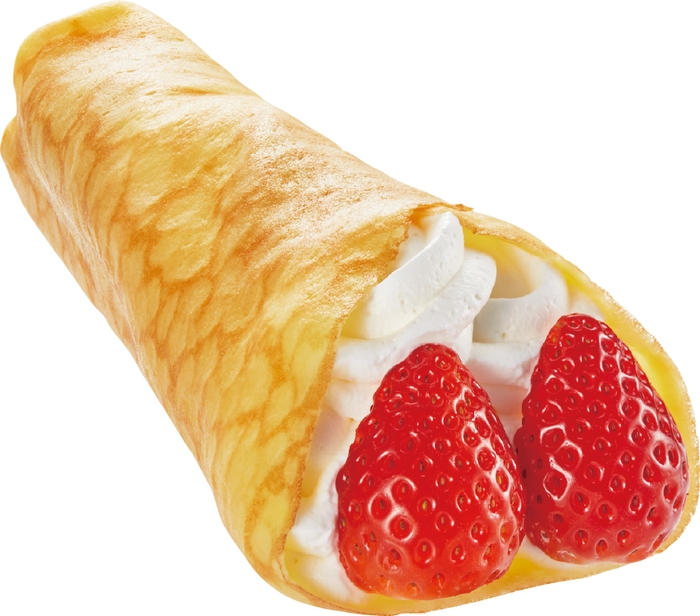 【内容】いちごのムース・ダイスと、ホイップクリーム等をもちもち食感のクレープで包み、フレッシュいちごをのせたクレープです。