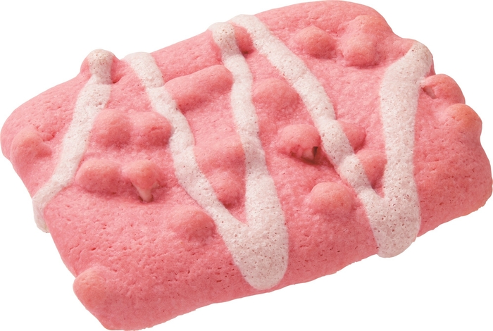 もちっとしたパン生地に鮮やかなピンクの生地をかぶせ、いちご果肉入りの甘酸っぱいいちごクリームを包んで焼き上げました。