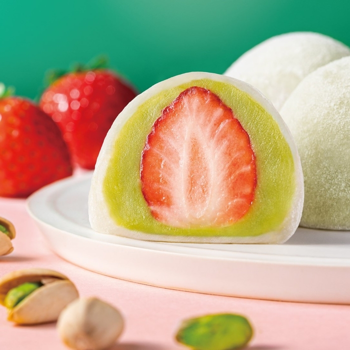 11月の大粒和栗大福・和栗のモンブラン大福に続き、12月は甘酸っぱい苺と爽やかな香りで色鮮やかなピスタチオあんを、やわらかな羽二重餅で包んだ『ピスタチオ苺大福』(1個270円(税込)・期間限定)を直販店舗(東京・神奈川28店舗)にて販売いたします。