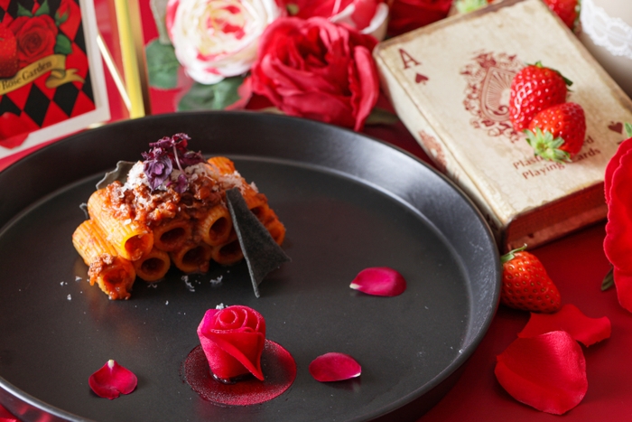 パスタは、“リガトーニ”という太めで満足感のあるパスタを使用。ふくよかなハートの女王をイメージ。