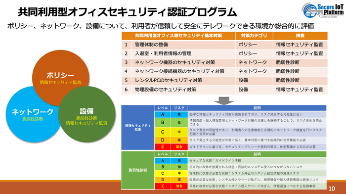 当テレワーク施設は、一般社団法人日本テレワーク協会および一般社団法人セキュア IoT プラットフォーム協議会による、「共同利用型オフィス等セキュリティ認証プログラム」に基づき、最高レベルのトリプルスターに適合していることの認証を受け高度なセキュリティ機能を装備したテレワーク施設となりました。