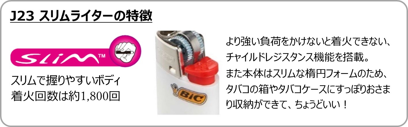 BICライターは、本体には耐熱性・耐圧性の高くて厚みの薄いデルリン樹脂を使用し、さらに安全基準を遵守した上でガス充填量をより多くしています。製品の生産精度の高さから、ガスを使い切るまでの着火確度を上げることで、ライターの使用期間を長持ちさせています。J26レギュラーライターは約3,000回の着火回数(一般的なライターの約3倍)。ごみ消費も1/3に抑える地球にやさしいライターです。