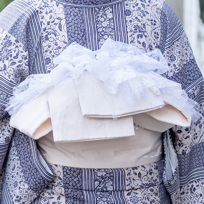 色のついているレースを使用しているため、着物と統一性を持たせるのもよし、差し色として使用するのもおすすめです。