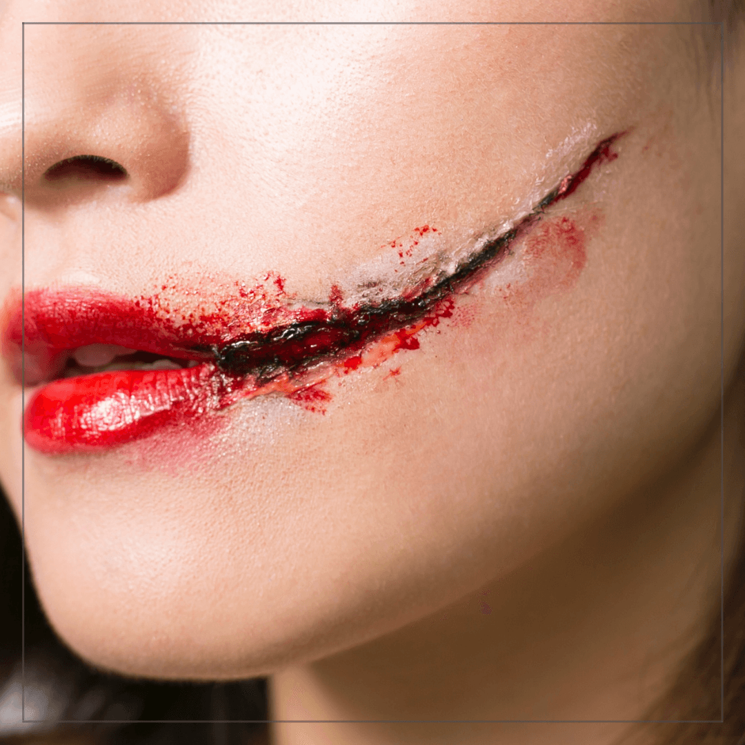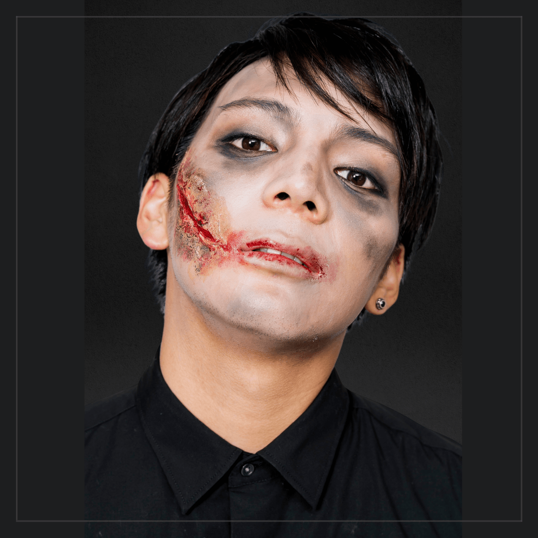 目の横、おでこ、頬の中からご希望の場所に5cm程度の傷メイクを施します。