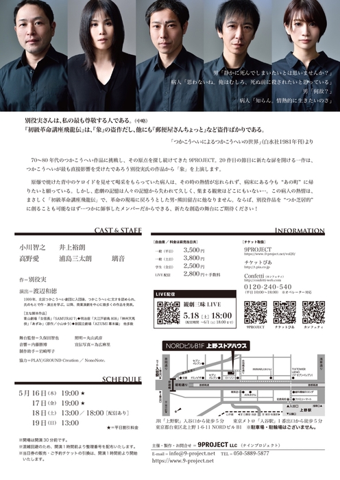 9PROJECT主催、『象』が2024年5月16日 (木) ~2024年5月19日 (日)に上野ストアハウス(東京都台東区北上野1-6-11NORDビルB1)にて上演されます。