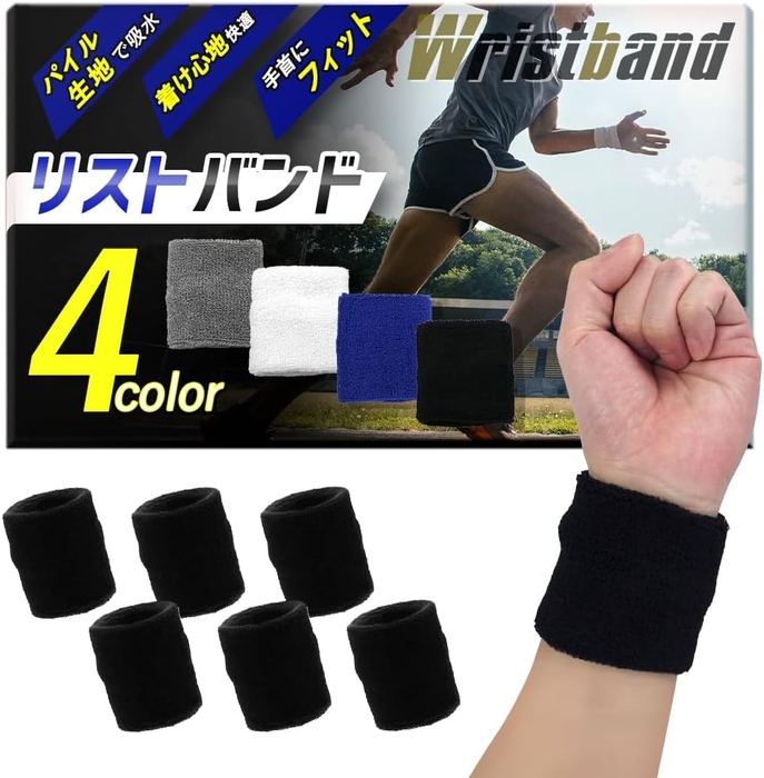 スタイリッシュでシンプルなデザインのリストバンドは、ブラック・ホワイト・グレー・ブルーの4色展開で、どんなスポーツウェアにも合わせやすいです。