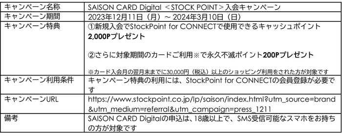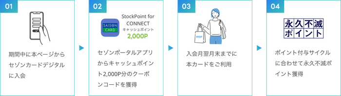 本キャンペーンで、SAISON CARD Digitalをお申込みいただくと、StockPoint for CONNECTで利用できるキャッシュポイントをプレゼントいたしますので、今まで提携ポイントを保有しておらずポイント運用をご利用いただけなかった方も体験して頂くことが可能となります。