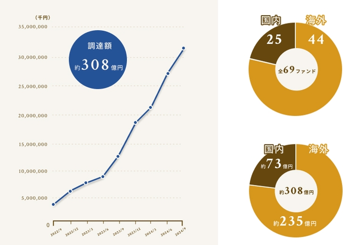 リリース後1年で累計調達額25億円、2年で80億円、3年で200億円を突破し、69号ファンドをもって、累計300億円を超えるに至りました。順調に実績を積み重ね、近時は飛躍的に規模を拡大しております。