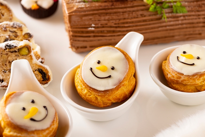 シェフからの“クリスマススペシャルスイーツ”として、ジューシーなりんごのコンポートとジュレ、ミルクアイスにリーフパイと可愛いくまのオーナメントを飾った「クリスマスギフト☆アップルパフェ」と、ふわっと淡雪のような口どけ食感のレアチーズスイーツ「クレームダンジュ」をお一人様一品限定でご用意します。「クリスマスストロベリーショートケーキ」をはじめ、クリスマスの定番「ベルギーチョコのブッシュドノエル」や「シュトーレン」、ドイツの伝統スイーツ「フランクフルタークランツ」のほか、雪だるまの顔が可愛い「雪だるまシュー」、ベイクドなのにスフレのような食感の「リッチチーズケーキ」などをお楽しみいただけます。スイーツの合間に、ホテルオリジナルカレーやサラダなどの軽食もお召し上がりいただき、しょっぱい&甘い無限ループでクリスマススイーツをご堪能ください。