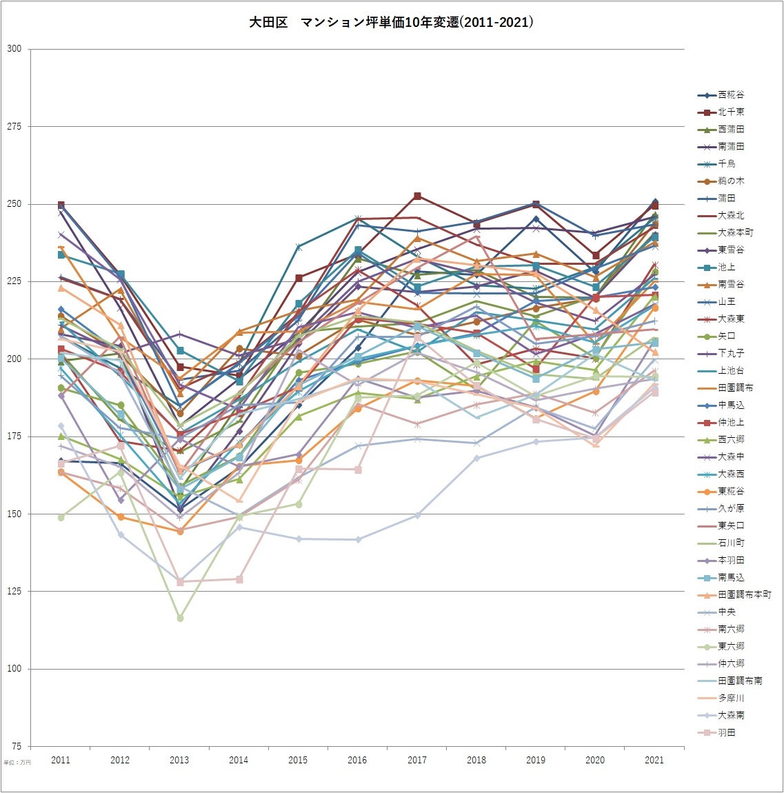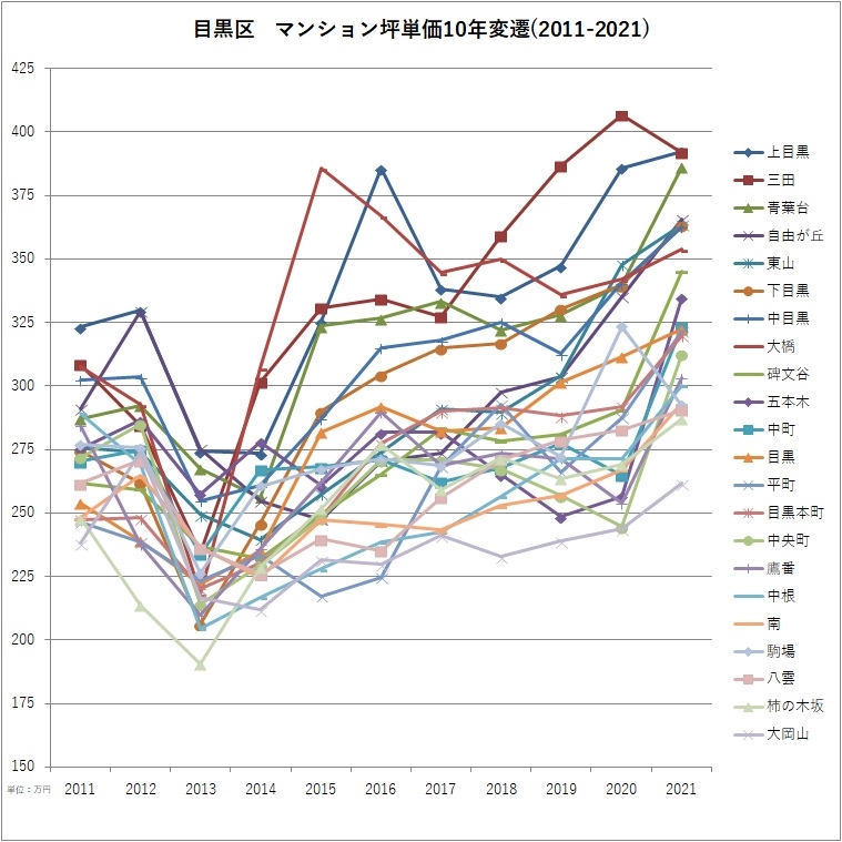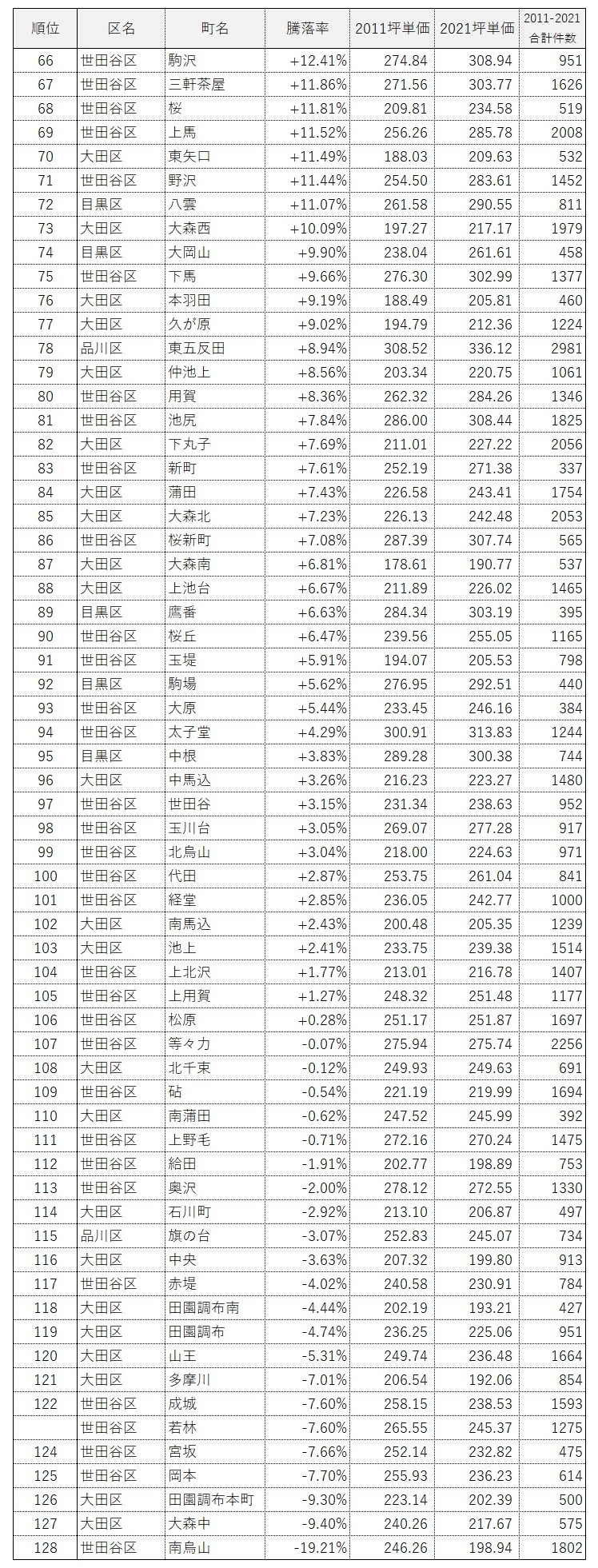 2011年と2021年のマンション坪単価より騰落率を算出。