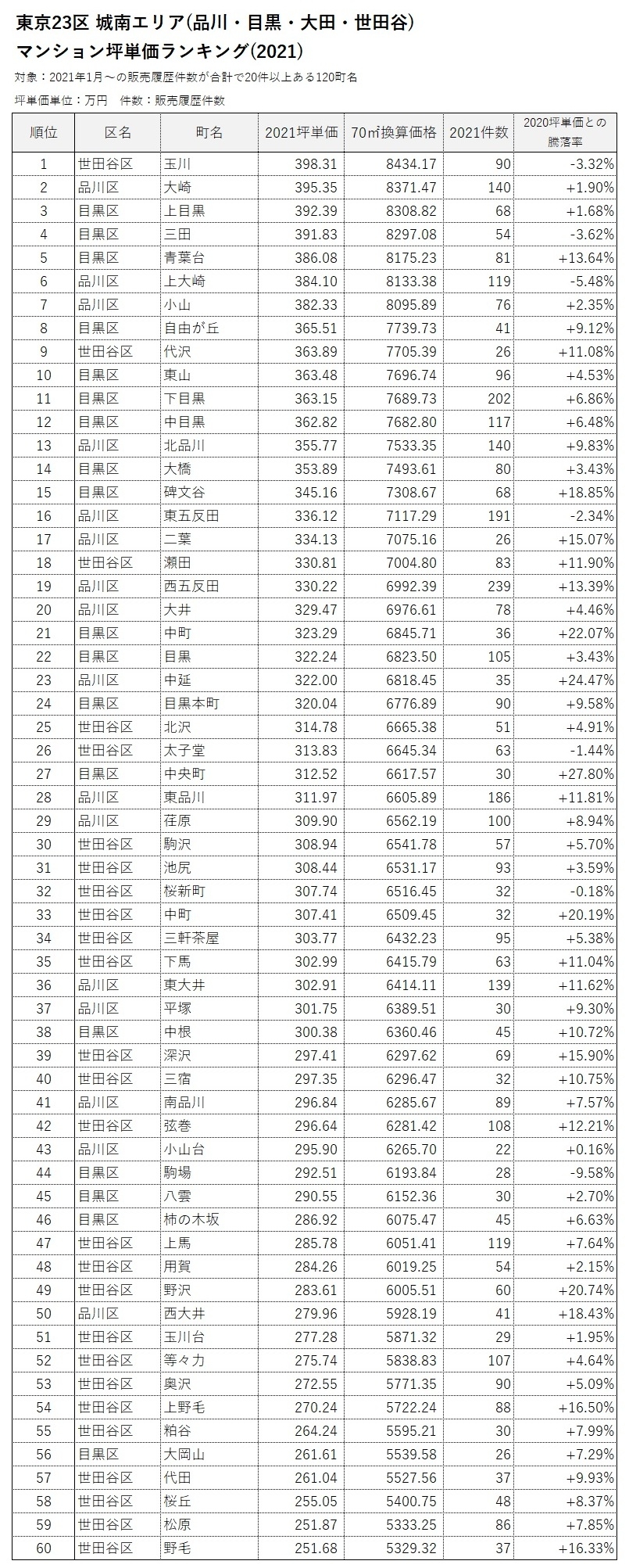 第4弾となる今回は、「城南」(品川・目黒・大田・世田谷)をピックアップ。歴史のある高級住宅地が点在するエリアでの、マンション坪単価および騰落率ランキングを発表いたします。