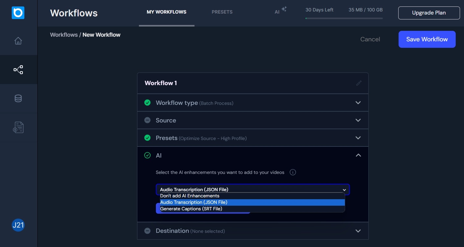 「Beamrクラウド」では、事前に定義した「ワークフロー」を元に、ビデオの軽量化を行います。「ワークフロー」設定画面では、入出力ファイルの場所や、画面解像度やコーデックなどのプリセットなどを定義しますが、新たにAIを利用したキャプション追加等を選択できるようになりました。GPUの能力を活用した本機能のリリースは、ビデオ処理を合理化するというビーマー社のミッションの新たな一歩となるものです。