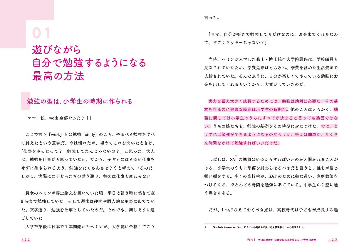 その答えの代わりに書いたのが、この本だ。そして結局、わが家の家庭教育が、3 人の娘をハーバードに合格させたDNA だということを発見したのだ。そして、そのDNA が具体的に何なのかを教えてあげれば、少しでも子どもを育てるすべてのお母さんたちの役に立てるかもしれないと考えた。本書が大切な子どもたちにとって、自分のなかにある偉大な巨人を発見し、目覚めさせるきっかけになってくれたらいいと思う。