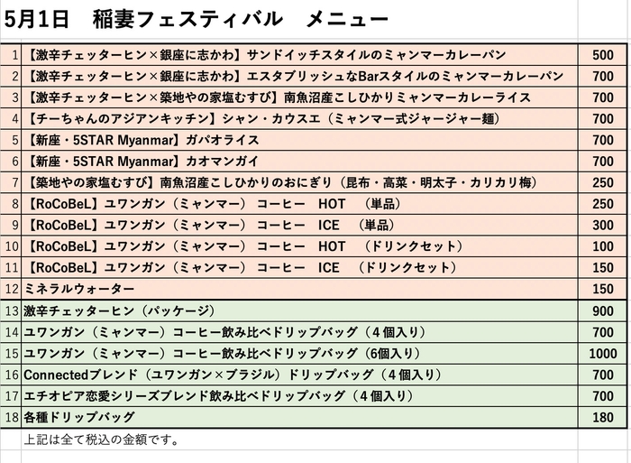ビーンズ・コネクティッド株式会社は炊飯器でお米を炊くように、誰でも簡単そして失敗なくコーヒー豆の焙煎ができる小型自動焙煎機の開発とそれを使ったコーヒー自家焙煎ビジネス・プラットフォーム「RoCoBeL(ロコベル)」の展開を目的に、現在、フィジビリティ・スタディをしている会社です。RoCoBeLの大きな特徴の一つがミャンマーの南シャン州にあるユワンガンからフェアトレードで購入したミャンマー産コーヒーを取り扱っていることです。この度、RoCoBeLフレンズとしてFSに協力いただいている店舗とともにミャンマー料理のキッチンカーを「稲妻フェスティバル」に出店します。そして、その目玉商品が既にテレビ等でよく知られている『チェッターヒン』と『水にこだわる高級食パン』とのタイアップで実現した特製ミャンマー・カレーパンです。