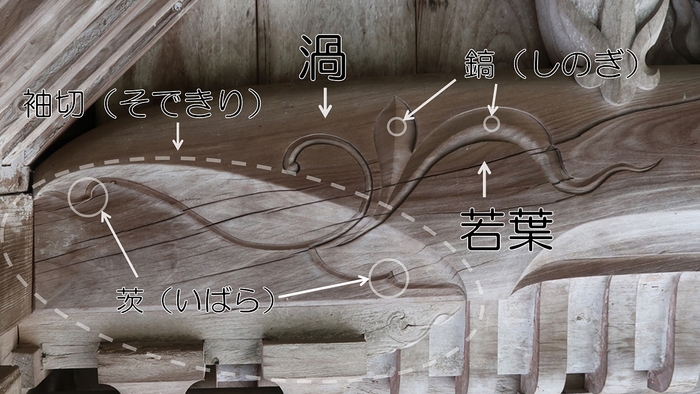 そこで今回は、「絵様(えよう)」に注目しては、というご提案をしてみようと思います。絵様というのは、虹梁(こうりょう:梁の一種)の表面に彫ってある、あのぐるぐる模様の事です。神社やお寺の建物には必ずと言って良いほどあるものなので、気を付けて探してみてください。
