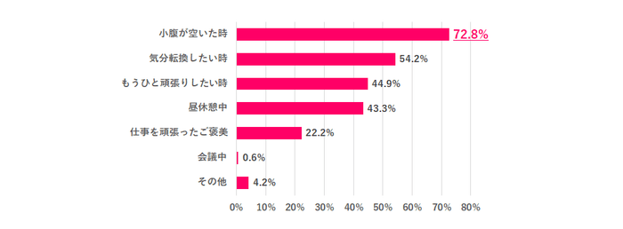 職場でお菓子を食べるタイミングを聞くと「小腹が空いた時」72.8%が最も多く、「気分転換したい時」54.2%、「もうひと頑張りしたい時」44.9%が続きました。