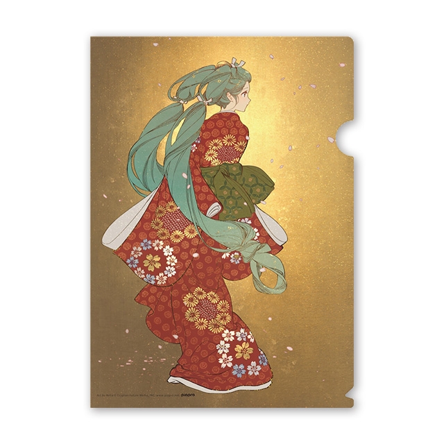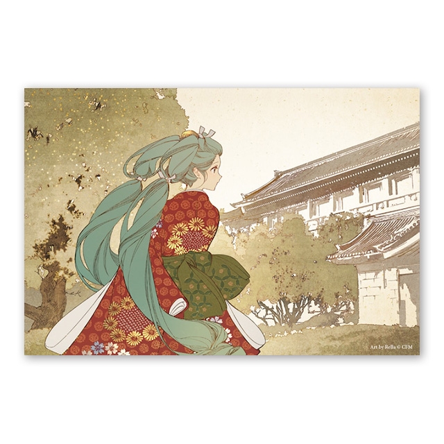 「見返り美人ミク」のキービジュアルは、国内外で活躍するイラストレーターのRella氏が担当しました。17世紀に絵師・菱川師宣が描いた美人画「見返り美人図」をモチーフに、紅色の鮮やかな振袖をまとい、前髪を立てて元結で結ぶ「吹前髪」姿のミクが、ふと振り返る一瞬を描いています。振袖の柄には桜と菊が円形にあしらわれた花丸模様が描かれ、帯は当時の人気役者の着こなしにちなんだ帯結び「吉弥(きちや)結び」と、江戸時代のファッションの流行が垣間見えます。