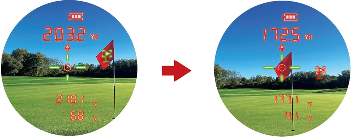 優先的にピンフラッグを計測し、振動と共にピンフラッグまでの距離をロックします。