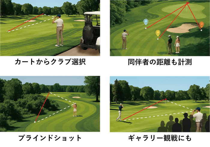 ボールの位置まで行かなくても、カートなどの離れた場所から目標物までの距離計測が可能です。