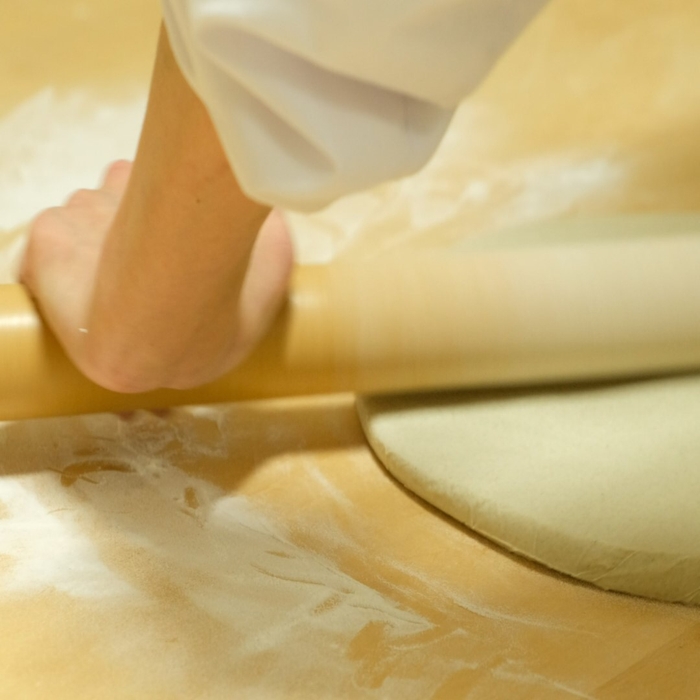 『⽔回し』『くくり』『練り』といった蕎⻨作りの上で難しい部分をプロが⾏い、真空包装し『ねり⽟』状態でお届けし