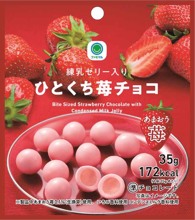 【内容】練乳風味のひとくちゼリーをあまおういちごのチョコレートで包みました。いちごミルク風味を楽しめる、ひとくちサイズのチョコレートです。