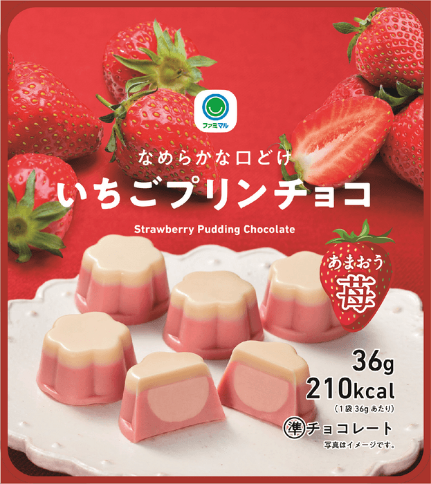 【内容】なめらかなくちどけが特徴なプリン形状のチョコレートです。あまおういちごのパウダーをふんだんに使用し、いちごの甘みと酸味が感じられるチョコレートに仕上げました。