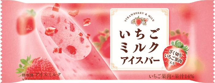 【内容】大きめカットの甘酸っぱいいちご果肉をたっぷり混ぜ込んだ、コクのあるミルクアイスといちごの絶妙な美味しさを楽しめるバーアイスです。