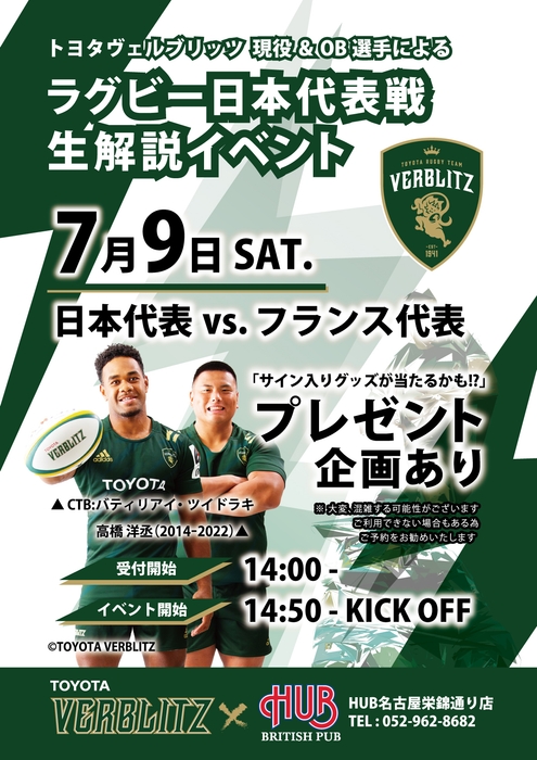 株式会社ハブ(本社:東京都千代田区、代表取締役社長:太田 剛)が運営するHUB名古屋栄錦通り店は、トヨタヴェルブリッツの現役選手とOBによる、ラグビー日本代表戦のリアルタイム解説イベントを開催いたします。