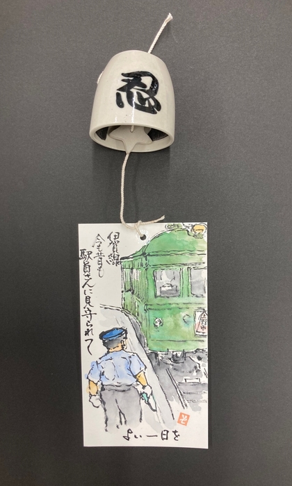 伊賀焼風鈴列車は、伊賀鉄道マスコットキャラクター「ふくにん」をデザインしたラッピング列車、ふくにん列車「伊賀の四季」号の車内に、伊賀焼の風鈴を飾り付けた列車で、本列車の運行は今回で17回目となります。風鈴の短冊は、地元絵手紙サークル(絵手紙いろは様)のご協力により、今年が“昭和100年”になるのを記念し、昭和時代の伊賀線関連の絵が描かれています。この機会に、ぜひ伊賀鉄道にご乗車いただき、列車の揺れで鳴る伊賀焼の風鈴の涼しげな音色や、昭和を感じる短冊をお楽しみください。