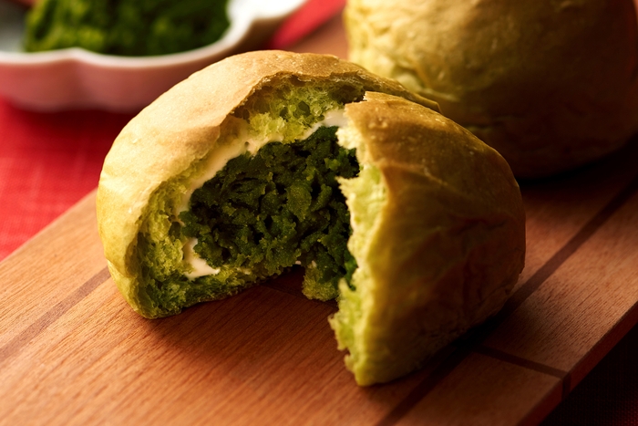 抹茶を使用したふんわり柔らかなパン生地に、特製のクリームと抹茶あんを2層仕立てで入れました。抹茶あんは、抹茶と相性の良いミルクあんをベースに、抹茶を贅沢に混ぜ合わせております。特製のクリームを一層足すことで、なめらかなくちどけとコクが加わり、抹茶あんの味わいを引き立てます。